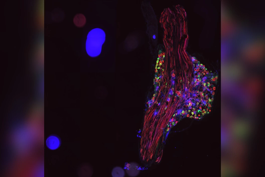 Coupe d’un ganglion rachidien dorsal de souris. Les neurones qui détectent la douleur apparaissent en rouge. L’image, qui a fait la couverture de la revue Pain d'octobre 2025, montre une coupe d’un ganglion rachidien dorsal de souris, une petite structure nerveuse contenant le corps cellulaire des neurones (ou fibres nerveuses) qui transmettent les signaux du corps vers la moelle épinière. Les neurones qui détectent la douleur apparaissent en rouge. Certains sont marqués en vert et d’autres en bleu selon leur type. Cette distinction permet aux chercheur·euses de cibler et de stimuler précisément certains groupes de neurones. © 2025 Isler M. et al. Pain (Wolters Kluwer Health, Inc.)