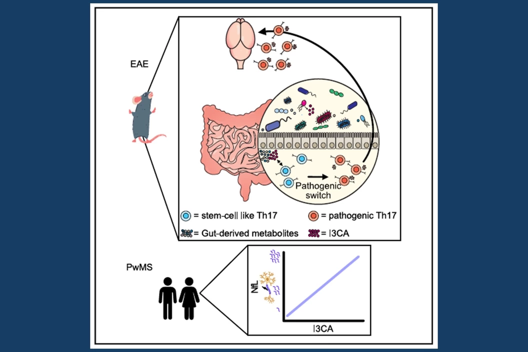 Dans cette étude, la Professeure Caroline Pot et son équipe mettent en évidence un rôle clé du microbiote intestinal – l’ensemble des micro-organismes présents dans nos intestins – dans l’aggravation des symptômes neurologiques de la SEP. En utilisant un modèle murin (souris) de la maladie, ils ont montré que certaines cellules immunitaires, notamment les lymphocytes Th17, passent par les intestins avant de s’attaquer au système nerveux central. Une fois dans les intestins, ces cellules deviennent pathogènes, c’est-à-dire qu’elles acquièrent des propriétés néfastes, en étant exposées à des substances produites par la flore intestinale.