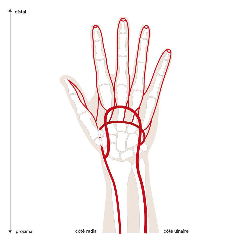 Le sang oxygéné est véhiculé depuis le coeur par le système artériel. La main est vascularisée par deux artères principales: l’artère radiale et l’artère ulnaire. Chaque doigt est lui-même vascularisé par deux petites artères. Lorsque les deux artères de la main ou d’un doigt sont sectionnées, l’apport en sang oxygéné est interrompu (dévascularisation ou ischémie).