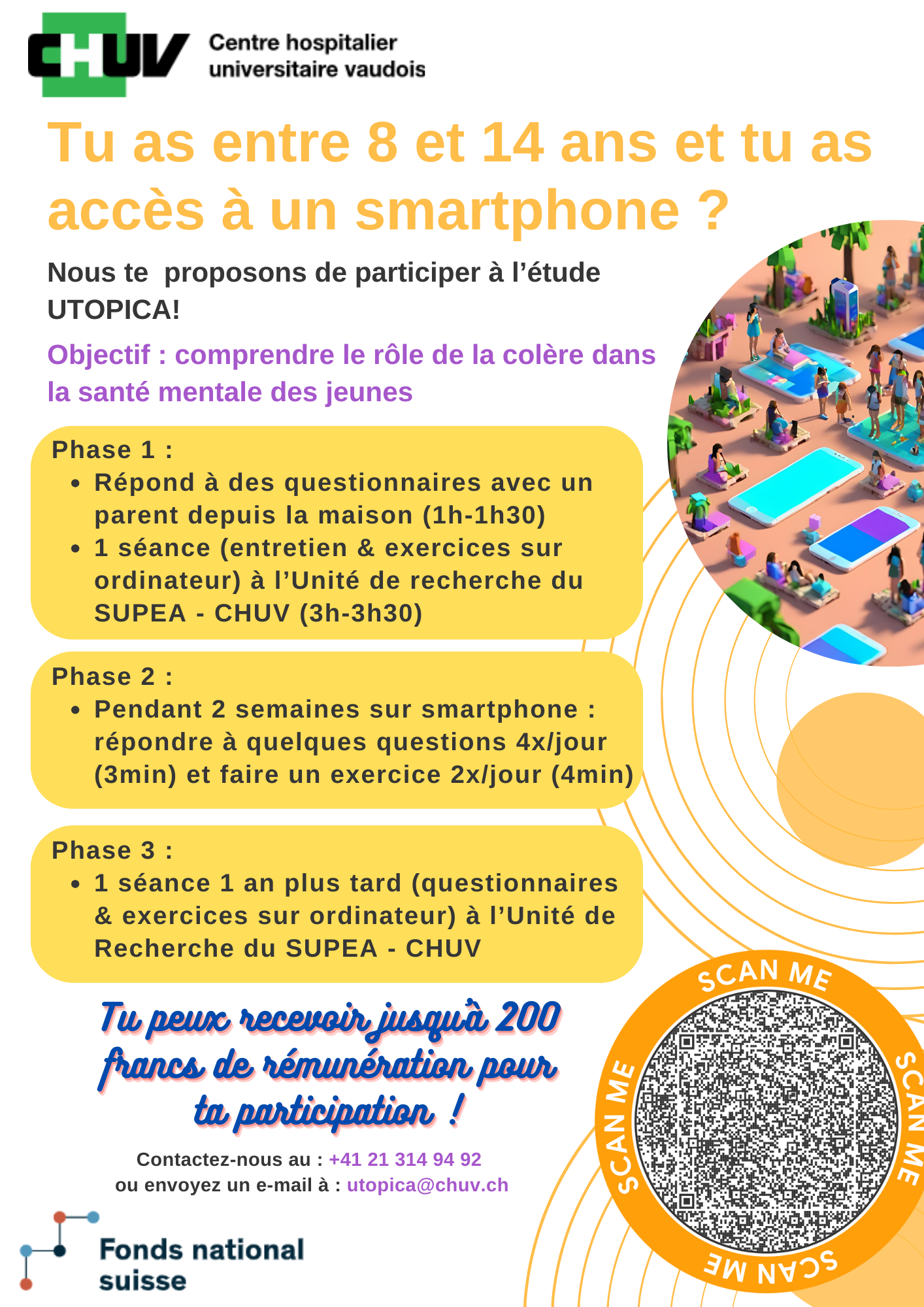 Dans le cadre d'une recherche financée par le fonds national suisse, nous cherchons des jeunes de 8 à 14 ans pour participer à notre étude qui vise à mieux comprendre la colère et son rôle dans la santé mentale.