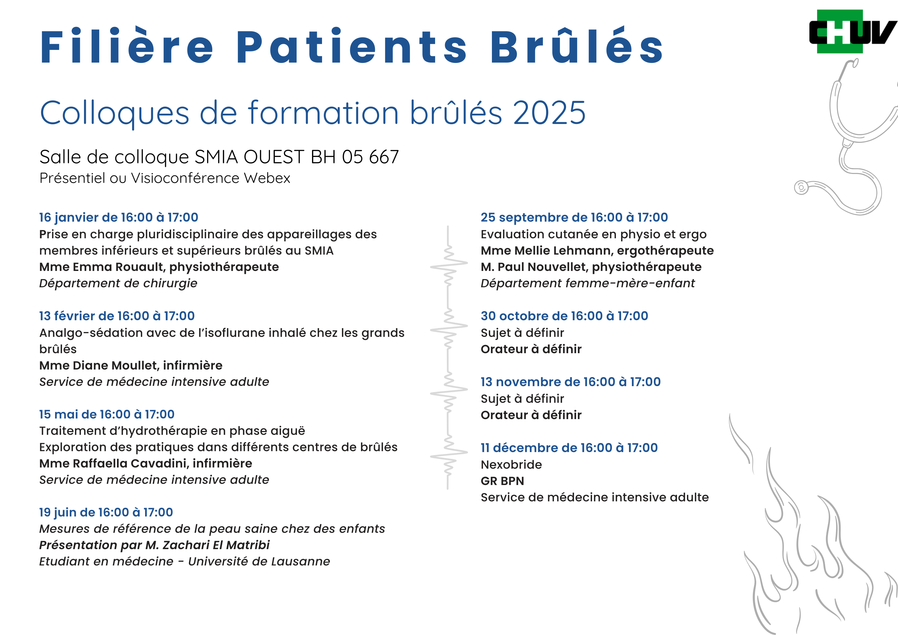 En collaboration avec les services concernés et le Centre des formations du CHUV, la filière brûlés organise cette formation destinée prioritairement aux médecins, infirmier-ères, ergothérapeutes et physiothérapeutes en contact direct avec des patients brûlés.