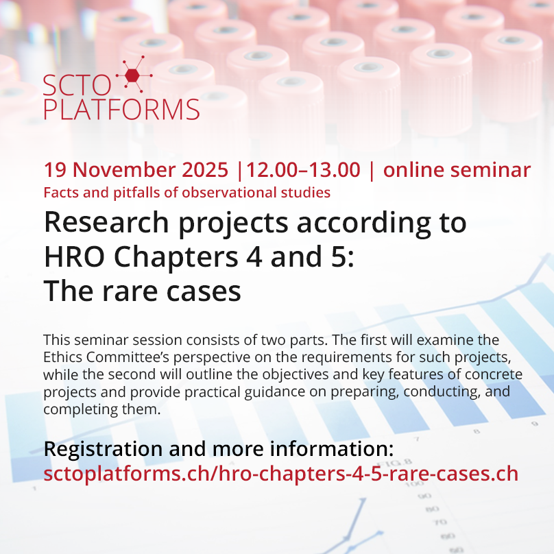 La Swiss Clinical Trial Organisation (SCTO), organisation faitière des Clinical Trials Units (CTUs) de Suisse dont le Centre de recherche clinique (CRC) du CHUV-FBM fait partie, vous propose cette série de séminaires gratuits et en ligne offrant des informations pertinantes et une place pour poser toutes vos questions sur des sujets liés aux études observationnelles. Pour en savoir plus sur l’ensemble de la série « Faits et pièges des études observationnelles – comment planifier et réaliser des projets ORH », suivez le lien ci-dessous pour participer :