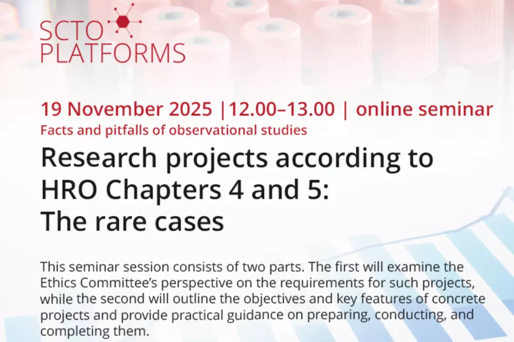 La Swiss Clinical Trial Organisation (SCTO), organisation faitière des Clinical Trials Units (CTUs) de Suisse dont le Centre de recherche clinique (CRC) du CHUV-FBM fait partie, vous propose cette série de séminaires gratuits et en ligne offrant des informations pertinantes et une place pour poser toutes vos questions sur des sujets liés aux études observationnelles. Pour en savoir plus sur l’ensemble de la série « Faits et pièges des études observationnelles – comment planifier et réaliser des projets ORH », suivez le lien ci-dessous.