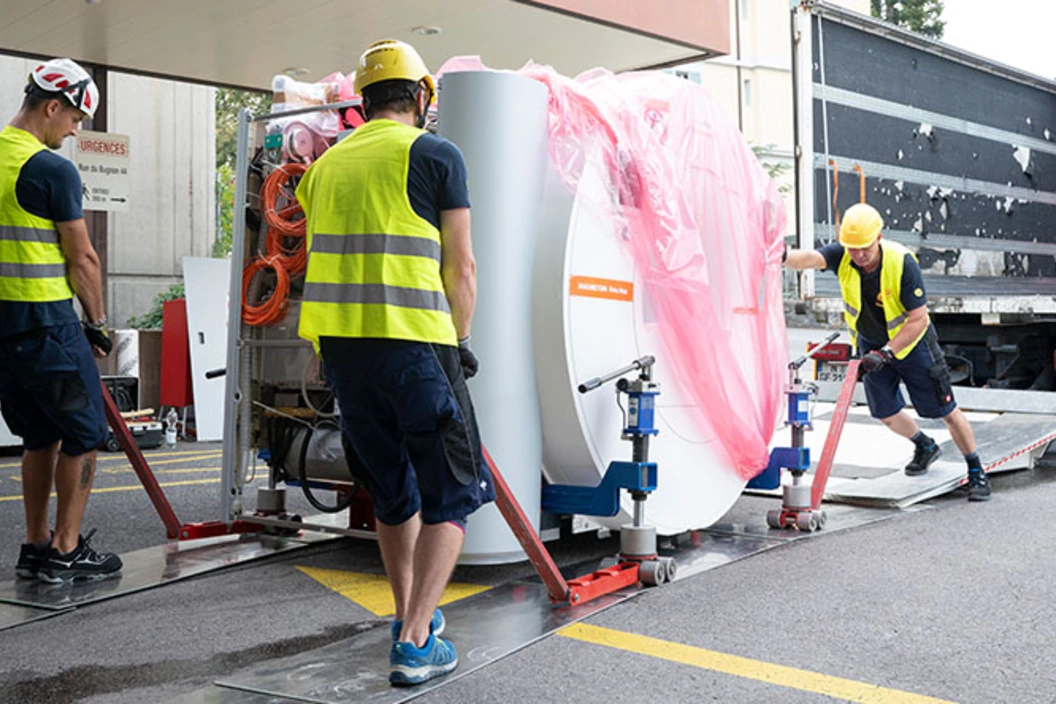 Cette fois, aucune grue n’a été nécessaire pour livrer au CHUV le dernier équipement IRM acquis conjointement par le CHUV, l’UNIL et le CIBM Centre d’imagerie biomédicale. Son poids d’environ 3 tonnes (contre 6 pour un système standard) et sa hauteur d’environ 2 mètres ont permis de le faire passer par les portes et les couloirs de l’hôpital. Un gabarit bien en dessous de la moyenne qui s’explique par le faible champ magnétique de la machine : seulement 0.55 tesla (T : unité de mesure de la force d’un champ magnétique) contre 1.5 à 3 T pour les appareils IRM conventionnels.