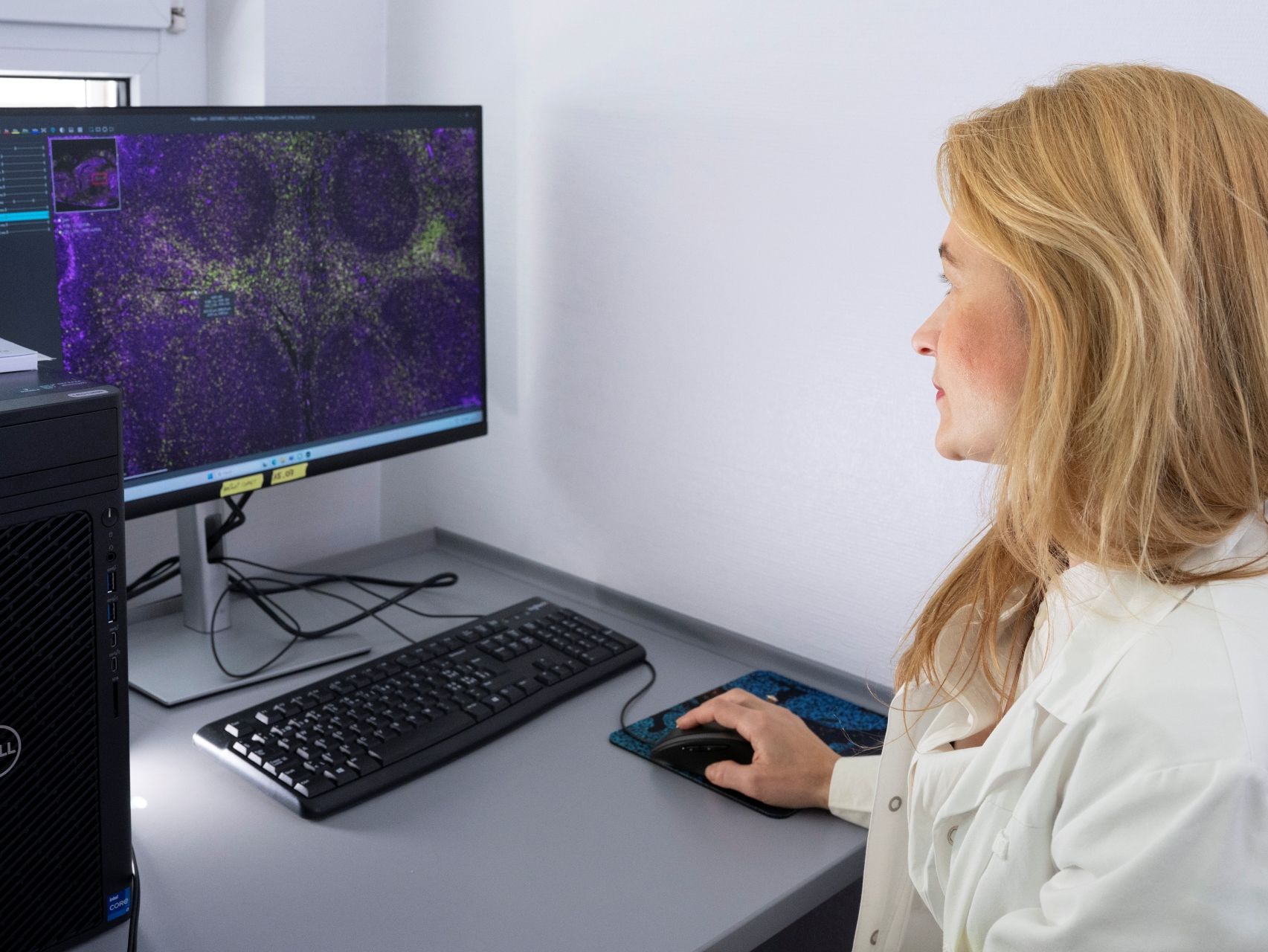 Depuis 2022, notre Institut a pris le pas de la transformation digitale, et depuis plus d’une année environ, la numérisation de l’ensemble des lames histologiques est systématique. Cette transition représente un changement de pratique assorti de multiples avantages. Une lame numérique se conserve durablement, se consulte à distance, se partage plus facilement entre nous ou avec des experts externes si nécessaire et permet certaines mesures plus précises. Surtout, c’est le socle du développement de la pathologie computationnelle et des outils d’aide au diagnostic et un support précieux pour l’enseignement.
