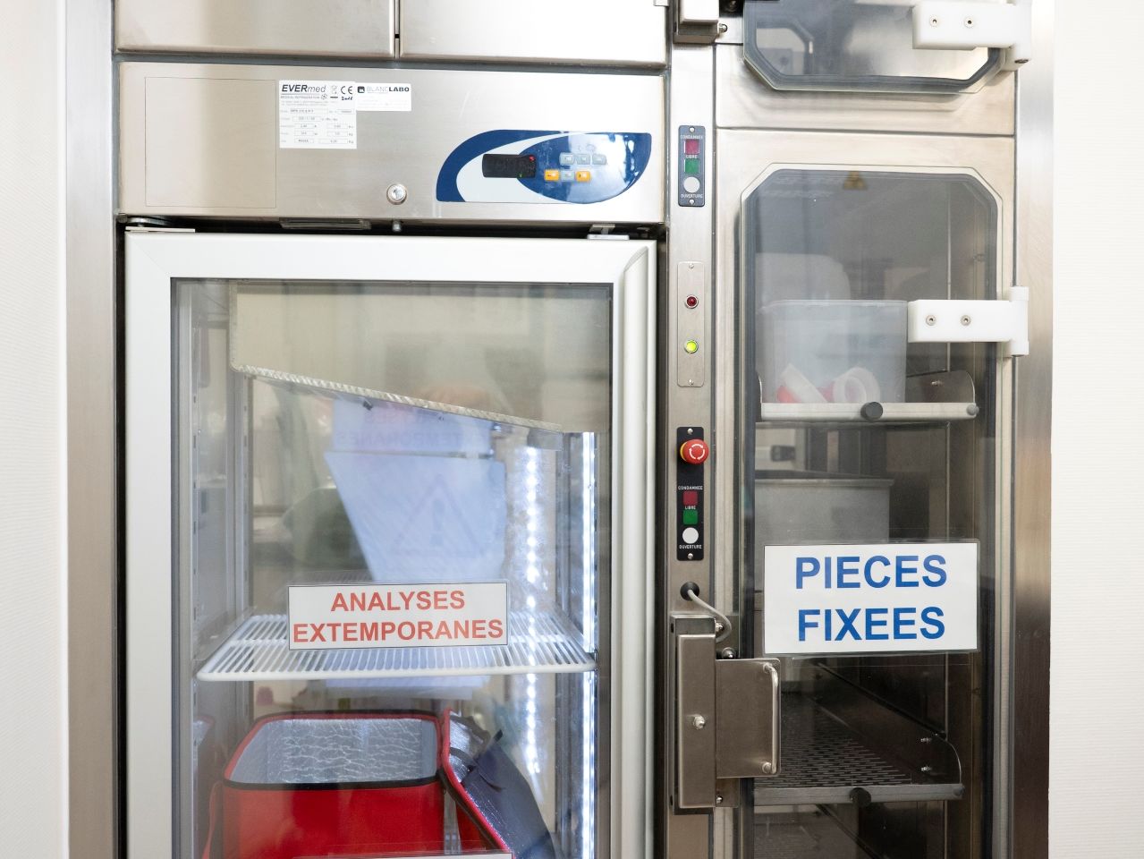 Nous avons une antenne rattachée à la pathologie chirurgicale, située près du bloc opératoire, dédiée aux examens extemporanés. Elle permet de prendre en charge des prélèvements frais pendant l’intervention. Concrètement, le tissu est congelé très rapidement, puis coupé pour obtenir des lames analysables en un délai court, afin de donner une orientation et aider le ou la chirurgien-ne à ajuster sa stratégie opératoire. Environ 350 à 400 interventions par an bénéficient de ce service. La proximité facilite aussi les échanges en direct avec l’équipe chirurgicale pendant l’intervention.