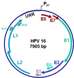 Le génome d'HPV code pour des protéines précoces régulant l'expression de gènes viraux à fonctions régulatrices (E1, E2) et transformantes (E6 et E7) et des protéines tradives constituant la la capside virale (L1 et L2). E1 et E2 sont exprimés dans les cellules basales de l'épithélium et facilitent la réplication et le maintien de l'ADN viral en tant qu'épisome dans le noyau des cellules infectées. E6 et E7 sont exprimées dans des cellules suprabasales capables de se diviser. La synthèse exponentielle de l'ADN viral et la production des protéines de la capside ont lieu dans les couches supérieures de l'épithélium infecté. L'assemblage du virion se produit seulement dans les couches squameuses, et les virions matures sont libérés avec les squames de kératine.