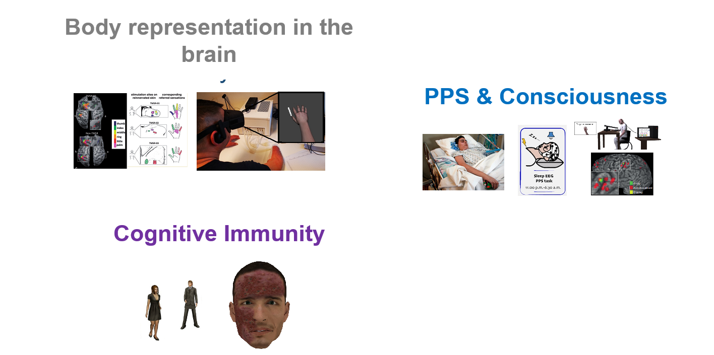 The main goal of the lab is understanding how the human brain builds a representation of the body in space, important for action and perception. To this aim, we use different techniques from cognitive neuroscience, including psychophysics, fMRI, intracranial EEG recording, neuropsychology and neural network modeling to study the multisensory mechanisms of underlying the representation of Peripersonal Space (PPS).