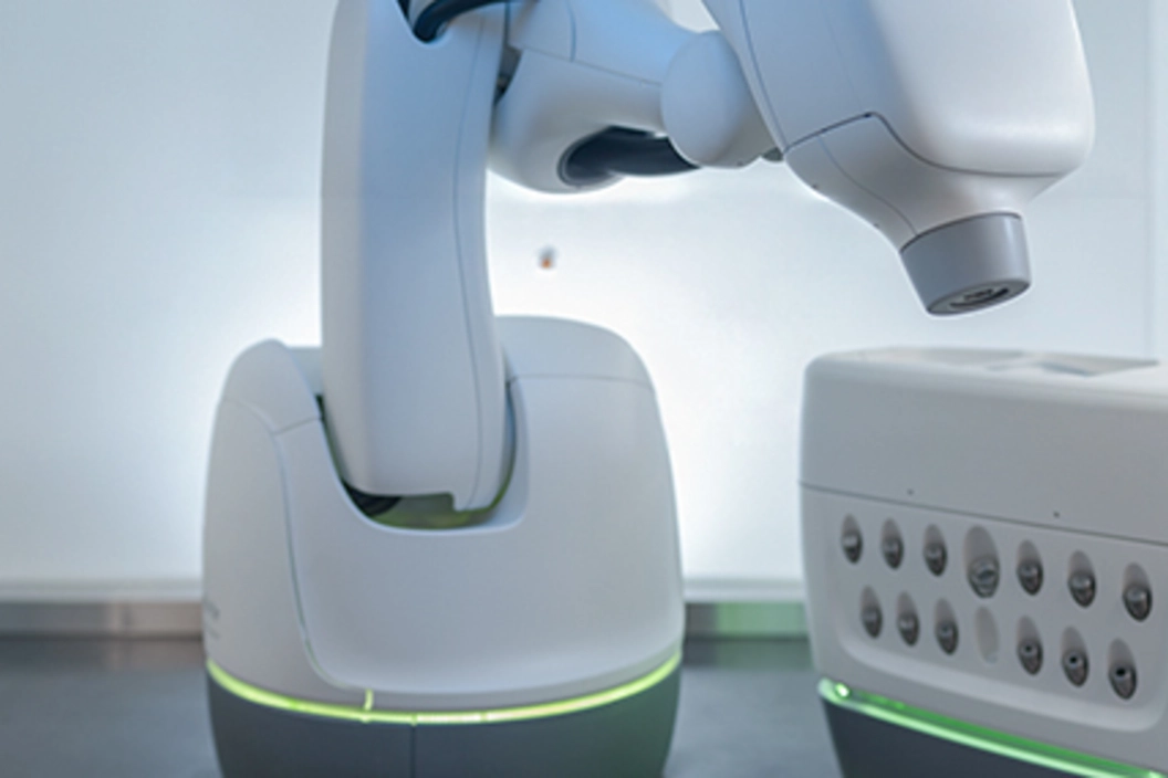 Grâce à un système de guidage par imagerie, il localise en continu la position exacte de la prostate et de la tumeur et suit les changements de position pendant le traitement. Les coordonnées spatiales de la prostate et de la tumeur sont transmises en temps réel à l’ordinateur de l’appareil qui les analyse afin de guider le bras robotisé qui délivre l’irradiation. De cette manière, les petits déplacements de la tumeur et de la prostate peuvent être corrigés par l’appareil. L’irradiation est ainsi localisée sur la prostate et la tumeur, et les dommages aux tissus environnants sont réduits au maximum.