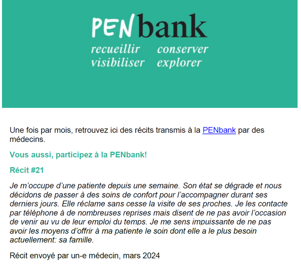 Il s’agit à présent d’implanter durablement la PENbank sur le terrain de l’hôpital et donc de mener un travail pour intégrer dans les usages et les habitudes des médecins aussi bien la mise en récits de leurs expériences que la transmission des récits vers la PENbank. Pour mener à bien cette mission, la PENbank a bénéficié, entre 2023 et 2026, du soutien de la Fondation Leenaards (réf. 7961.0/1).