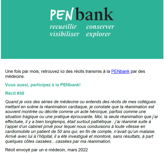 Depuis août 2022, un récit peut être lu chaque mois dans une rubrique dédiée de la newsletter interne du CHUV, In Fine, qui est envoyée à plus de 13’000 collaborateurs-trices.